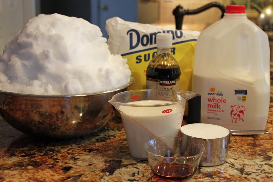 Mix milk, sugar, and vanilla together. Stir into snow. Spoon into bowls and enjoy!!